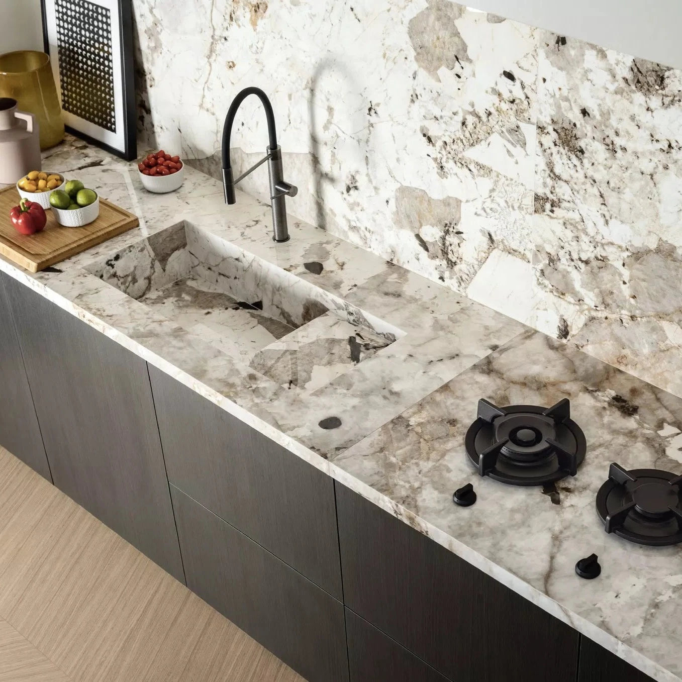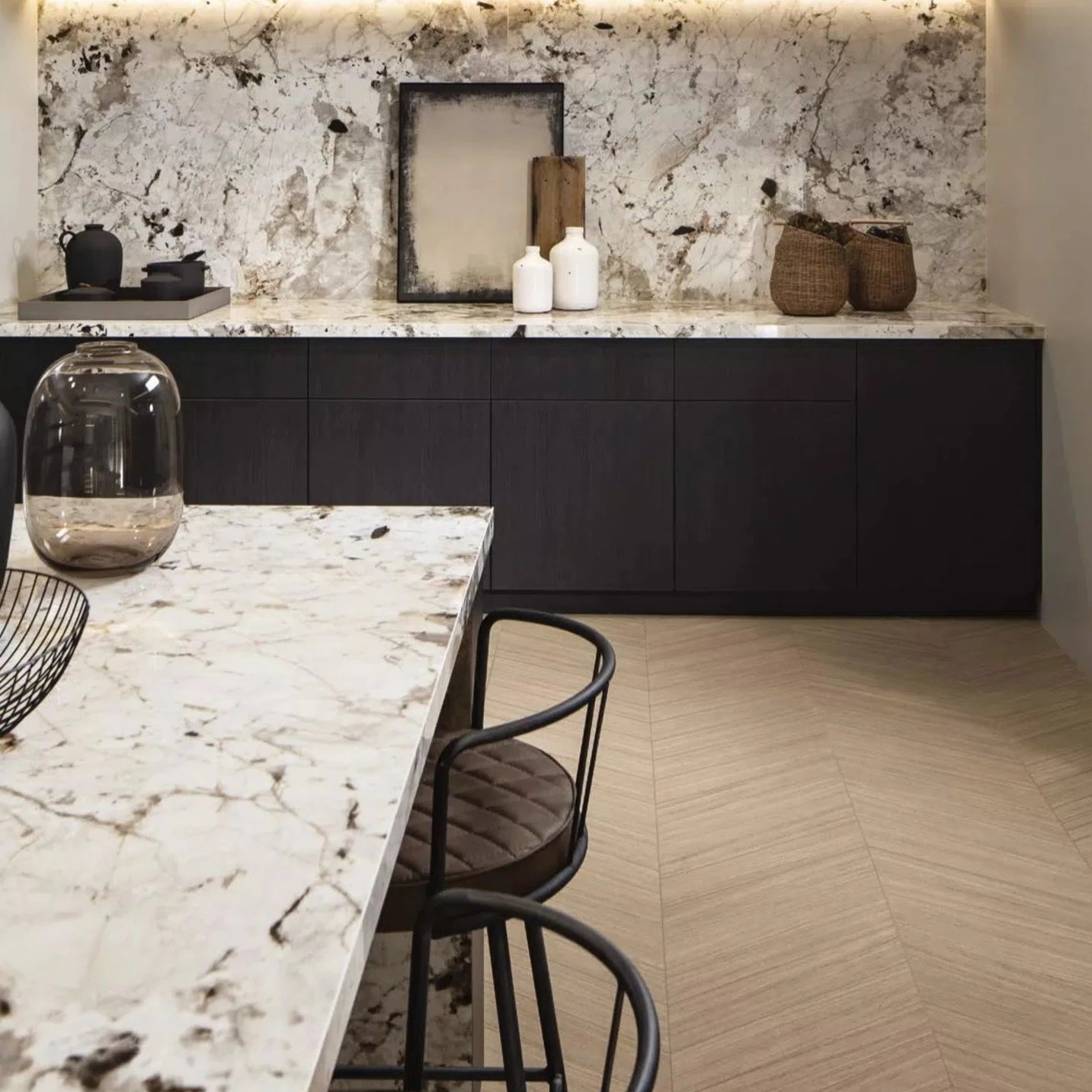 تصميم عصري وخالد: يوفر الجمع بين تصميم البلاطة الكبيرة وتأثير رخام تندرا تفسيرًا عصريًا للأناقة الكلاسيكية، ويجمع بين الجماليات الخالدة والأسلوب المعاصر.