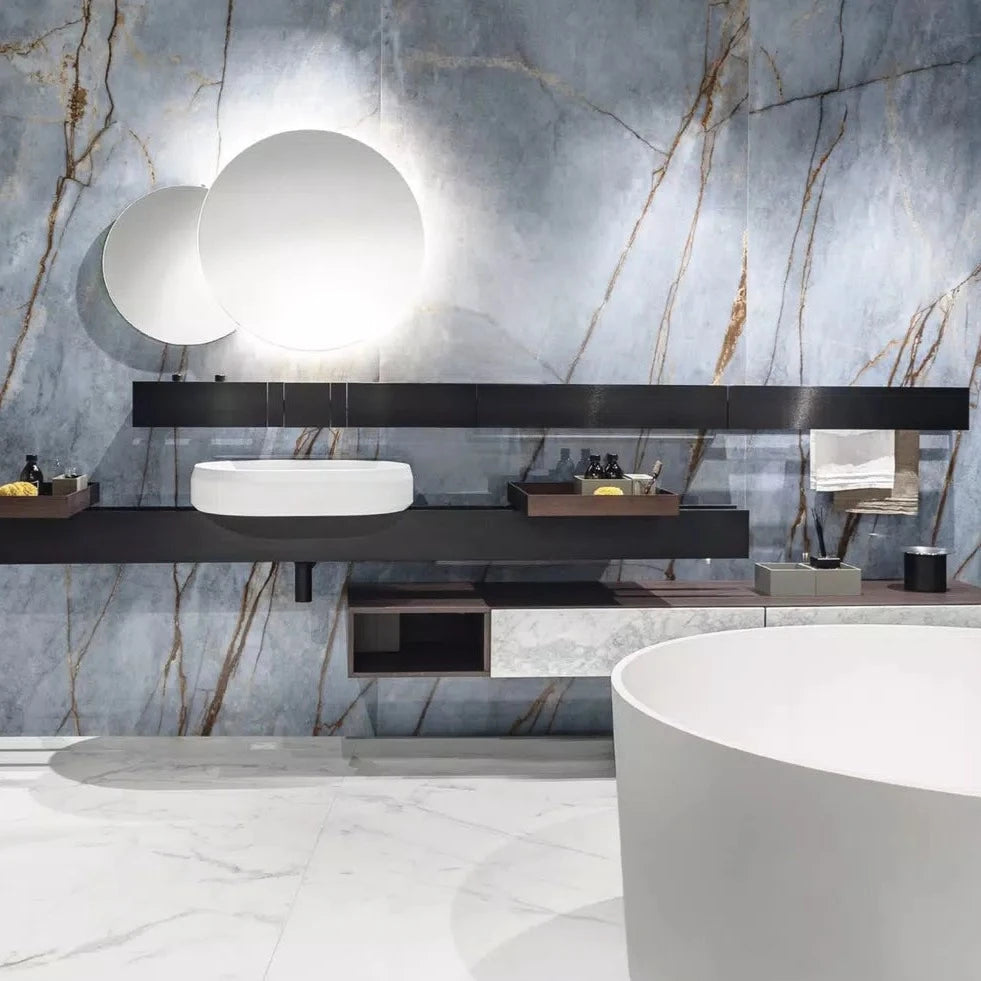 بلاط بورسلين كبير الحجم مع تأثير الرخام: انغمس في مساحتك بالفخامة مع هذا البلاط كبير الحجم الذي يحاكي جمال الرخام الخالد.