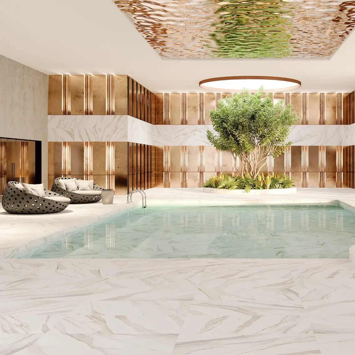 - Luxurious Marble Look: This tile mimics the timeless beauty of Calacatta marble, adding sophistication to any space.