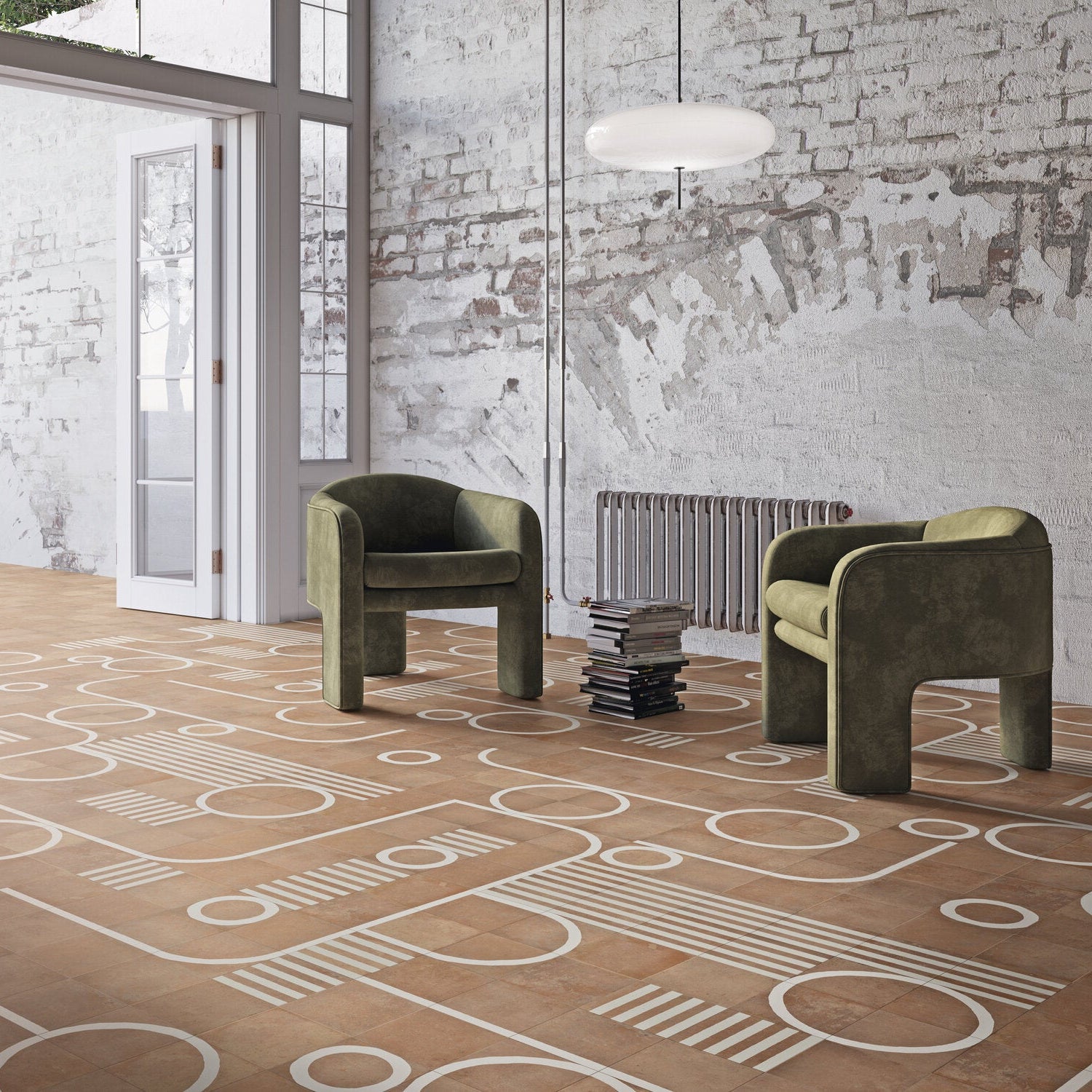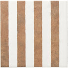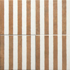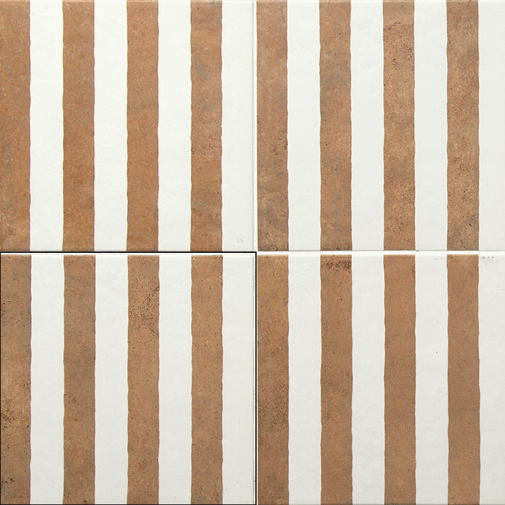Graphic Meets Organic: The Bands tile features a clean set of parallel white lines across its terracotta base—bringing a touch of structure without losing that earthy charm.