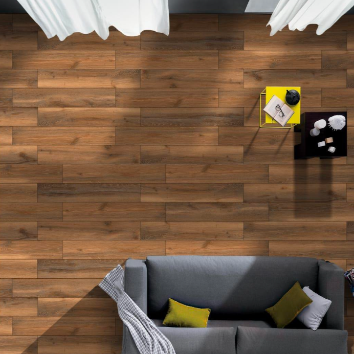 Brown Porcelain Tile: Immerse your space in the timeless appeal of Brown porcelain tiles, featuring a wood effect, 9 mm thickness, and expansive 20x120 cm size.