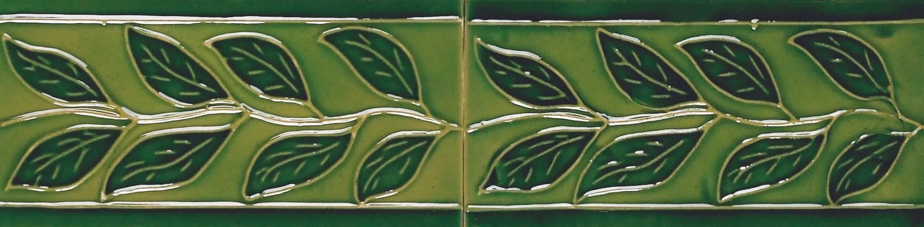Traditional Hand-Painted Portuguese Azulejos Arestas Tile, Leaves Verde Glossy, 7x14 cm