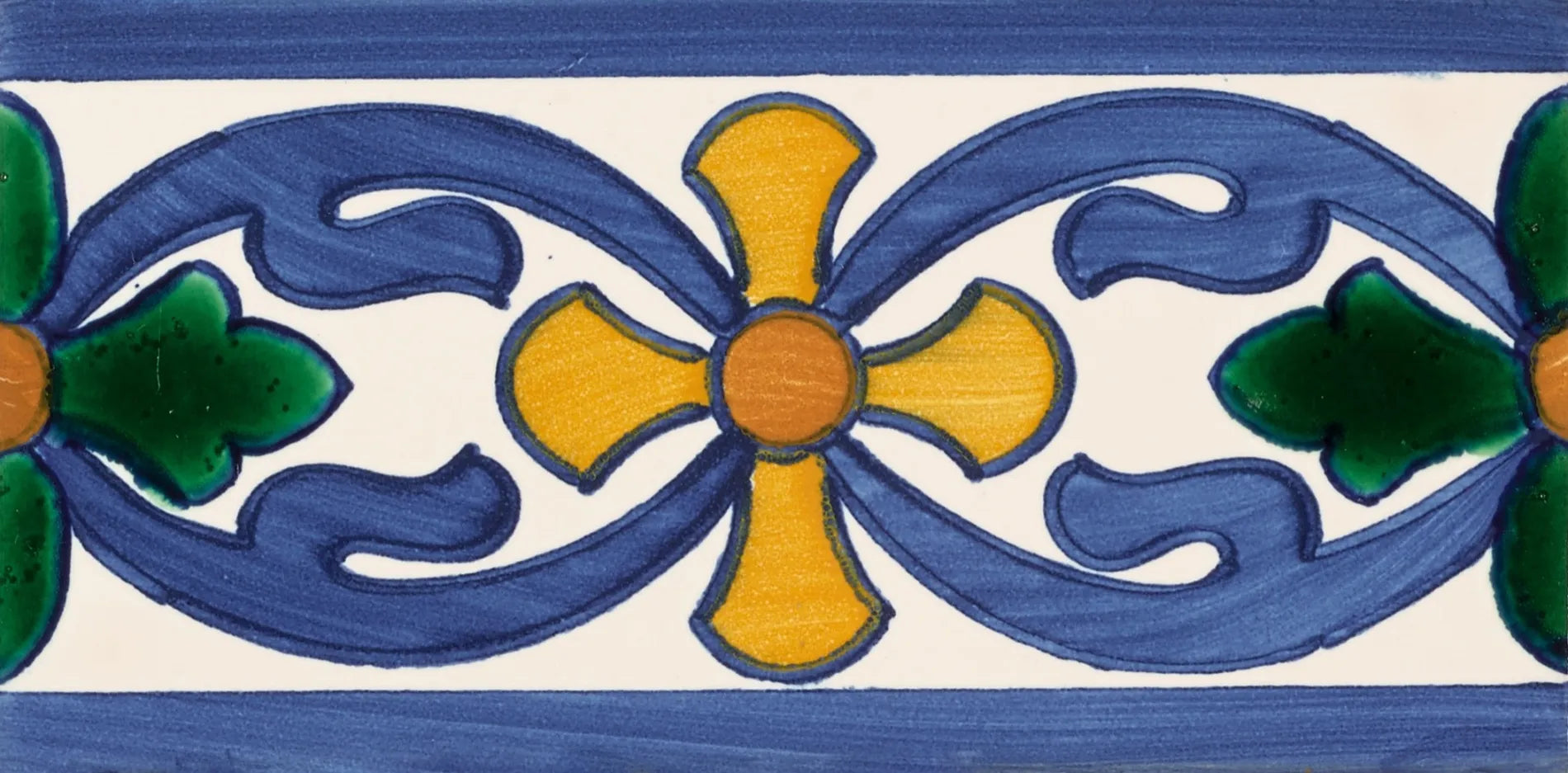 Traditional Hand-Painted Portuguese Multicolor Border Tile, Yellow & Green Flowers Glossy, 7x14 cm