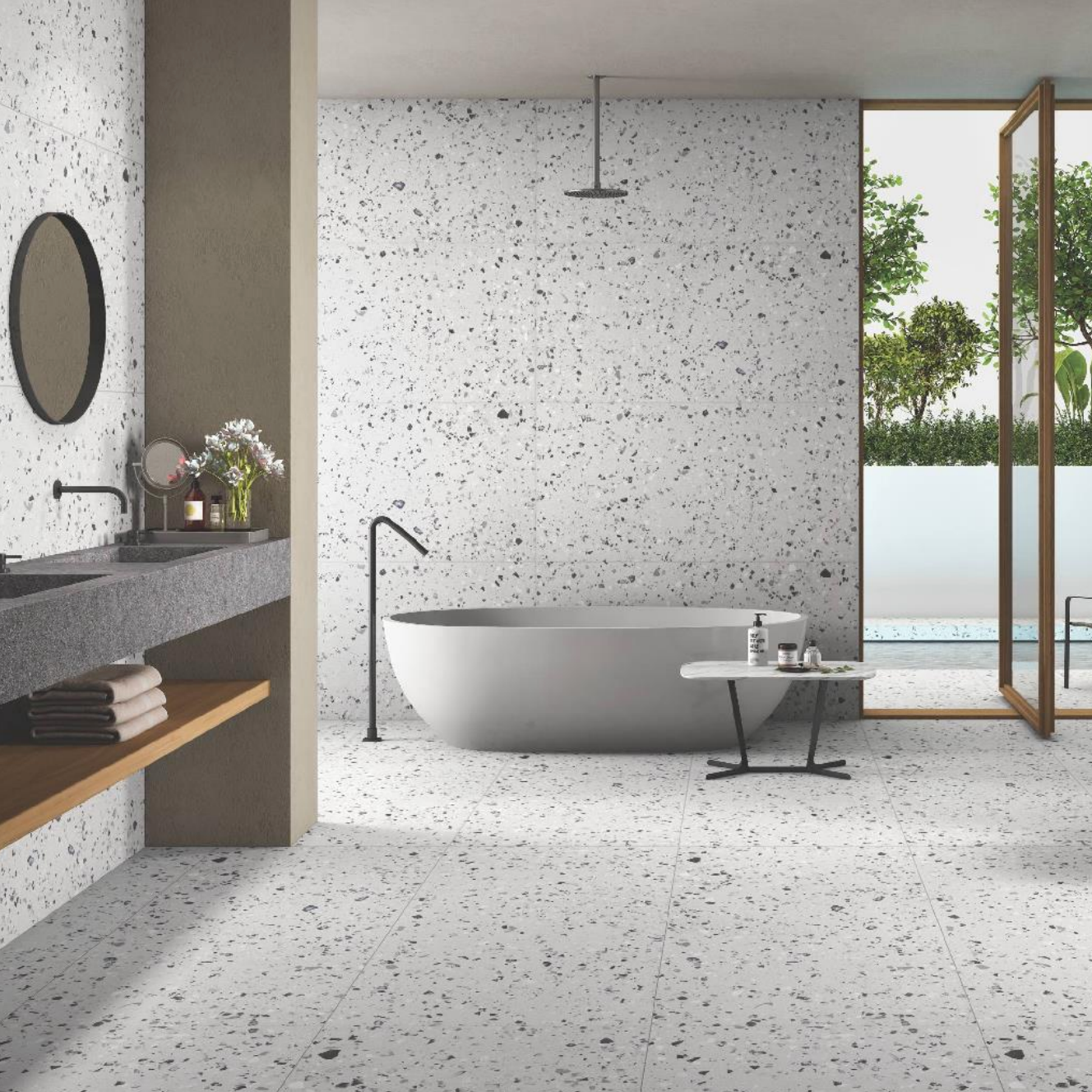 Porcelain Tile with Terrazzo Stone Effect: Embrace the timeless charm of terrazzo with this porcelain tile that combines durability with classic aesthetics.