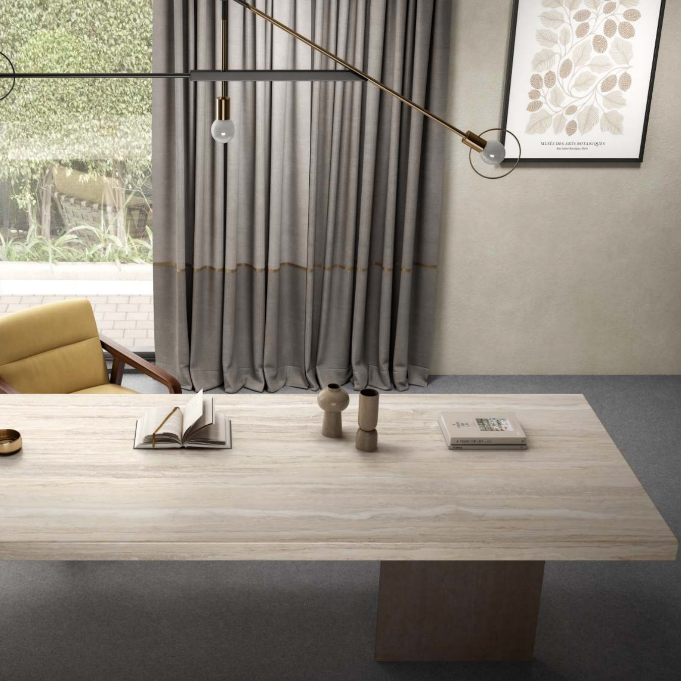 Modern and Timeless Design: The combination of the big slab design and travertine effect offers a modern interpretation of classic elegance, blending timeless aesthetics with contemporary style.